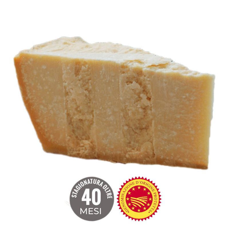 Una stagionatura di 40 mesi ne fa un formaggio dal profilo gustativo straordinariamente profondo e stratificato, con ricche note di caramello, spezie e un accenno di frutta secca.